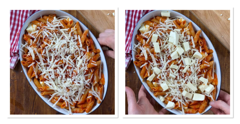 Versate metà della pasta su una pirofila, aggiungete qualche cubetto di mozzarella, ricoprite con la pasta rimasta, cospargete di parmigiano e aggiungete ancora qualche cubetto di mozzarella.