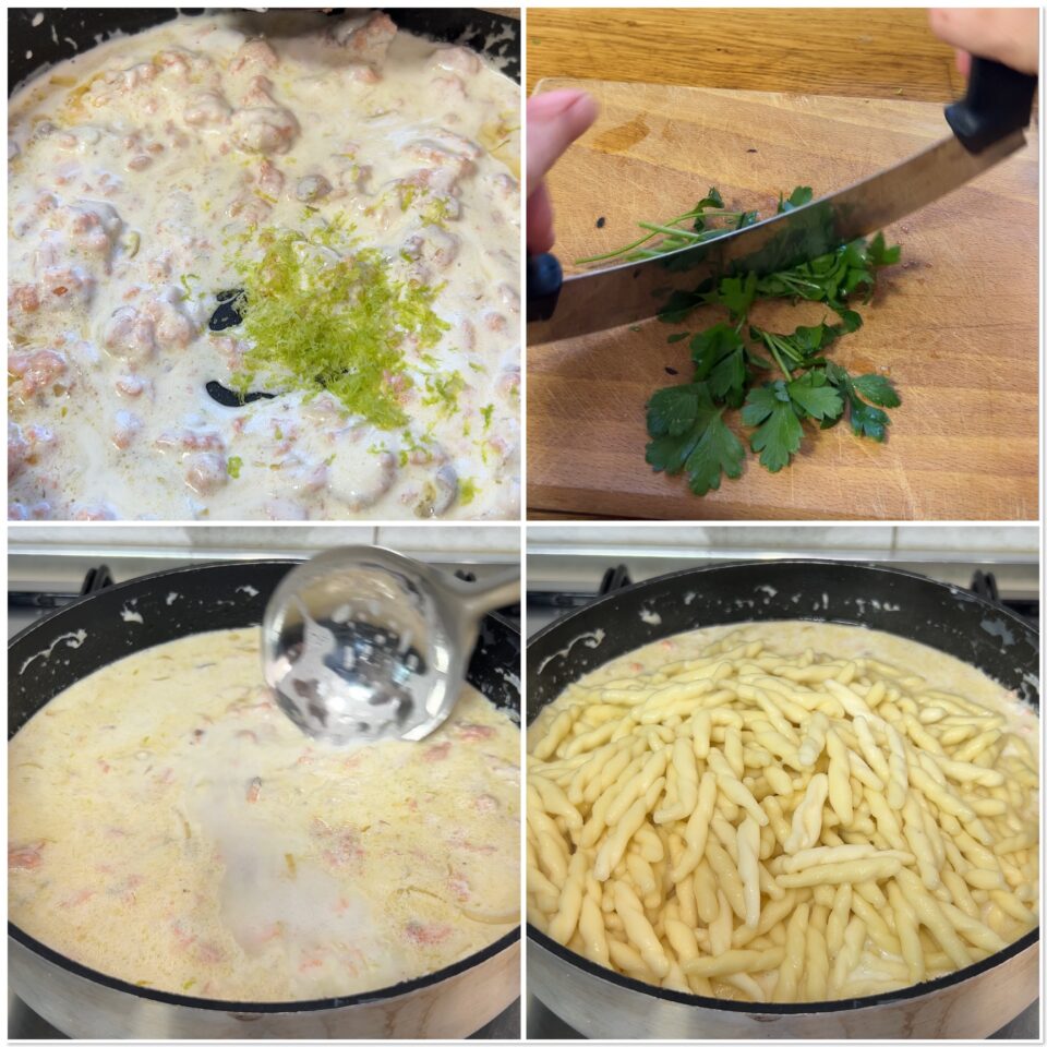 Unite la panna fuori fuoco e date ancora una grattugiata di limone, tritate il prezzemolo e tenetelo da parte. Raccogliete la pasta ancora al dente con una schiumarola e versatela sul condimento, precedentemente diluito con acqua di cottura della pasta.