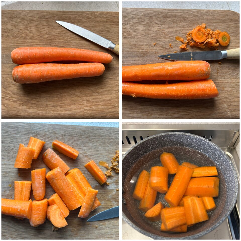 Per preparare questo condimento, iniziate pelando le carote, quindi sciacquatele sotto acqua corrente e tagliatele a tocchetti.