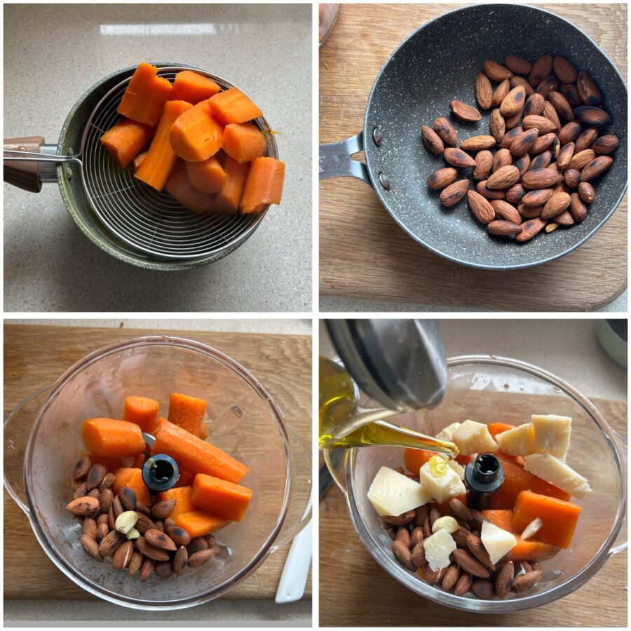 Trasferite le carote nel mixer insieme alle mandorle tostate, al parmigiano a al pecorino a pezzetti e allo spicchio d’aglio.