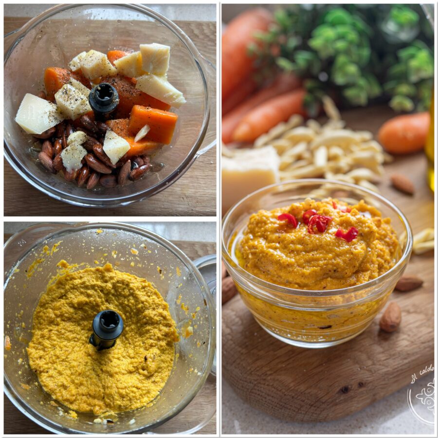 Il pesto di carote, come il pesto di cavolo nero è un condimento cremoso e delicato, perfetto per preparare un primo piatto semplice e gustoso in pochi minuti. Questo pesto di carote cremoso, realizzato con ingredienti genuini come carote lessate, mandorle tostate e parmigiano, è ideale per condire la pasta, preparare bruschette sfiziose o accompagnaresecondi piatti di carne e pesce.