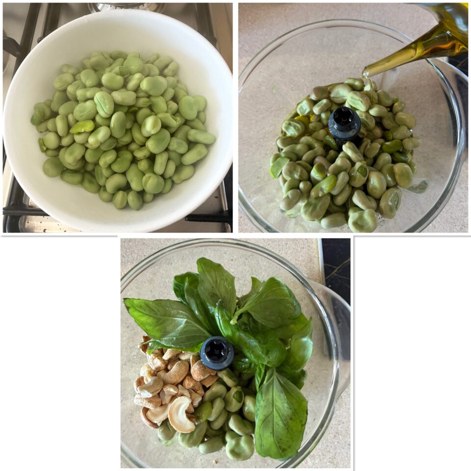 Raccogliete le fave pulite nel mixer, unite l’olio extravergine d’oliva, il basilico fresco, la frutta secca (come anacardi o mandorle), il parmigiano, il pecorino e l’aglio.