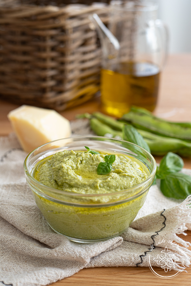 Questo pesto nasce proprio così, da una scelta semplice, fave fresche sbollentate per un minuti, basilico, parmigiano, pecorino, aglio e olio d’oliva. Si frulla tutto insieme e in pochi minuti viene fuori una crema liscia, profumata, perfetta per la pasta o anche solo su una fetta di pane, ottima alternativa al classico Pesto alla genovese.