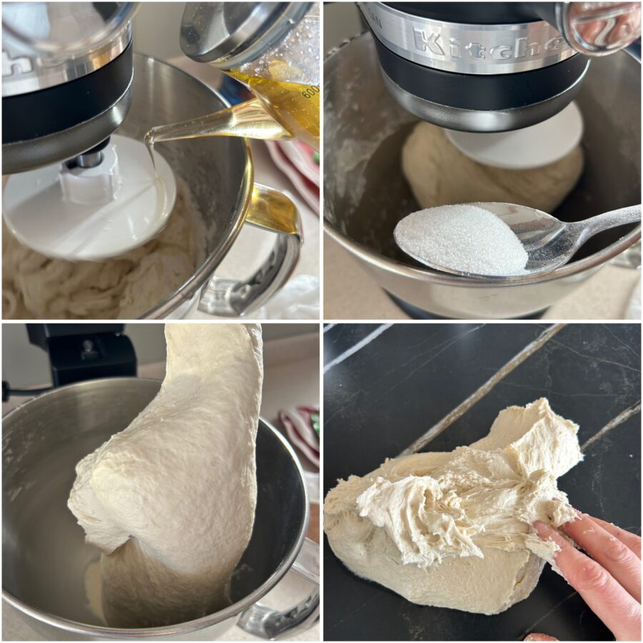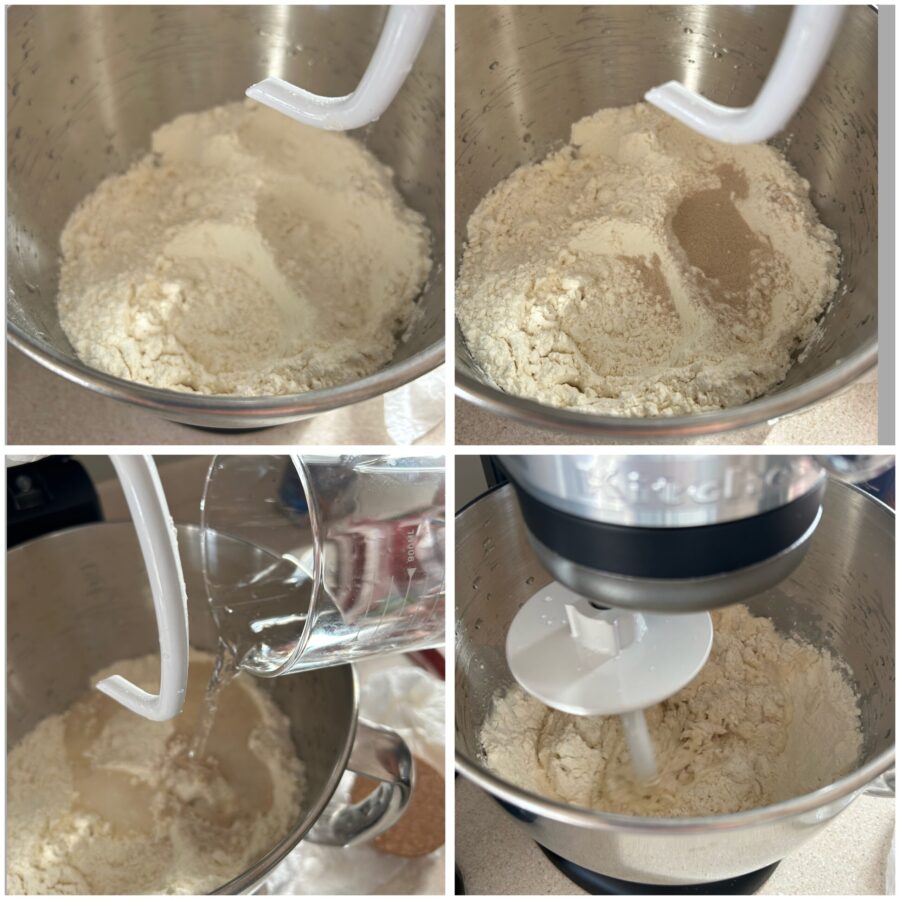 Per fare l’impasto raccogliete la farina e il lievito nella ciotola della planetaria, versate l’acqua e iniziate a scioglierlo. Impastare con il gancio, quindi aggiungete l’olio a filo e, solo alla fine, il sale.
