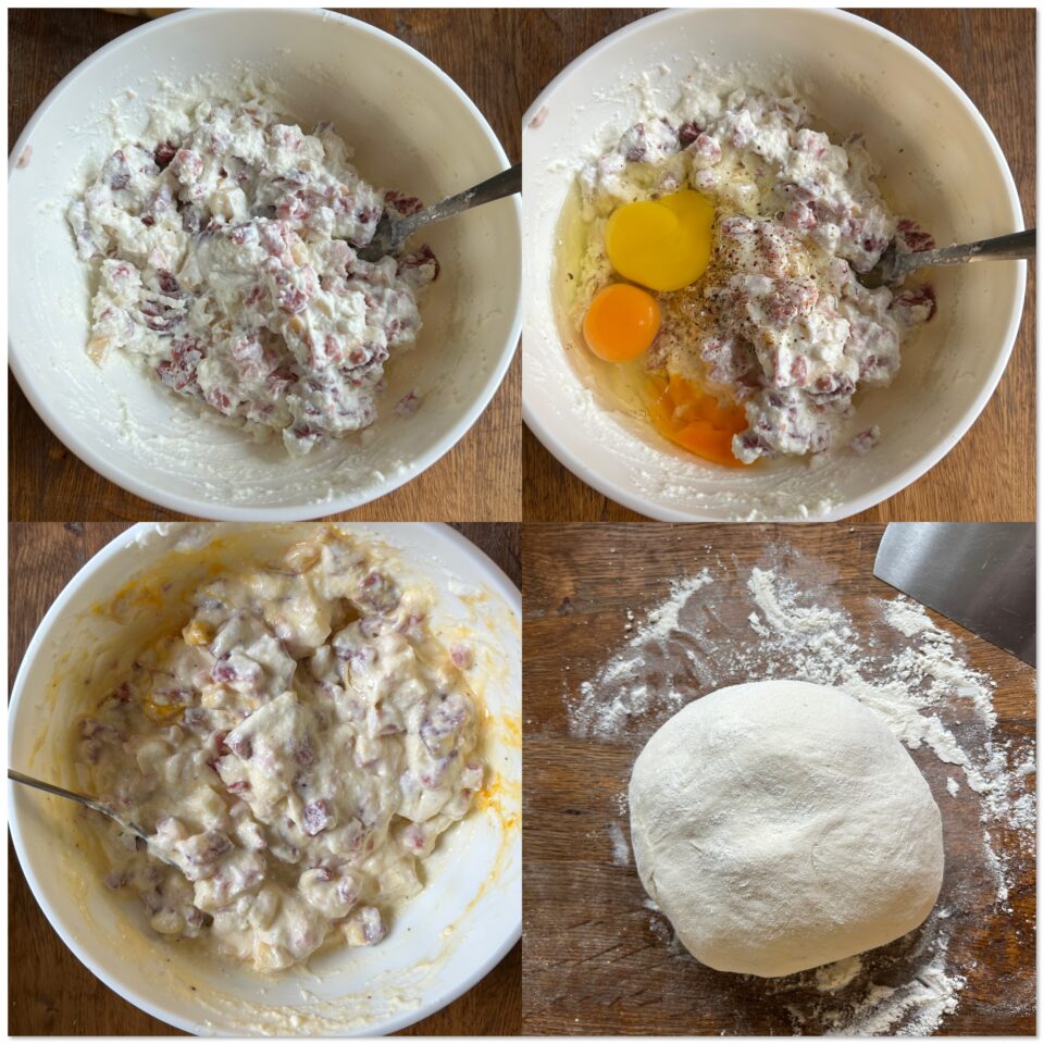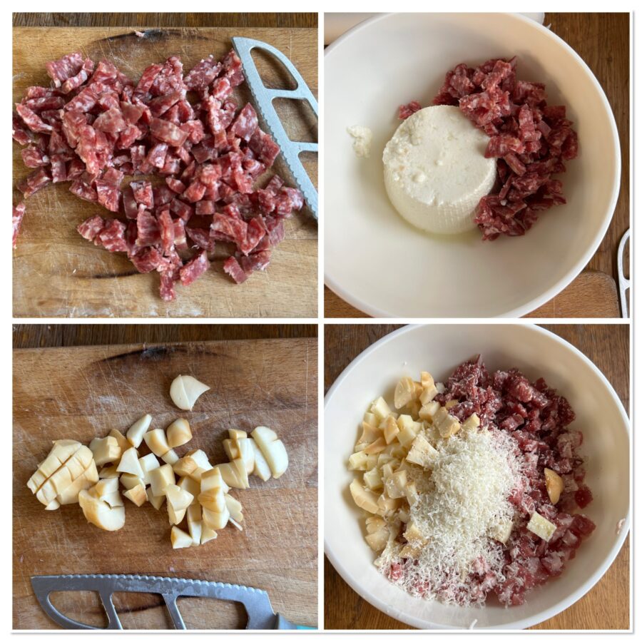 Nel frattempo dedicatevi al ripieno: tagliate a cubetti i salumi e i formaggi, poi raccoglieteli in una ciotola con la ricotta ben scolata. Mescolate con cura, unite il formaggio grattugiato,