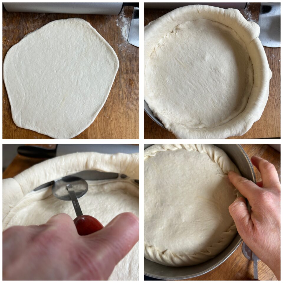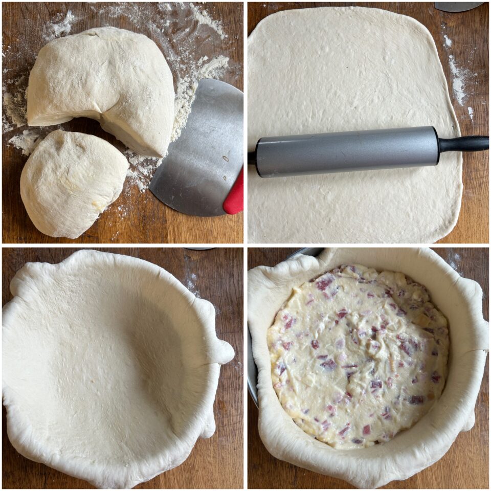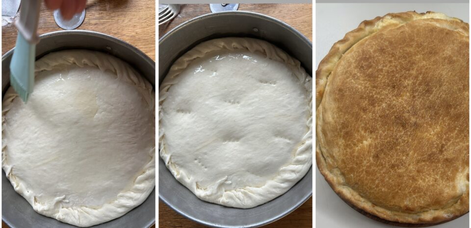Riprendete l’impasto lievitato e dividetelo in due parti, una più grande dell’altra. Stendete la parte più grande con il matterello e usatela per rivestire uno stampo ben oliato, lasciando i bordi alti. Versate all’interno il ripieno, livellandolo delicatamente.