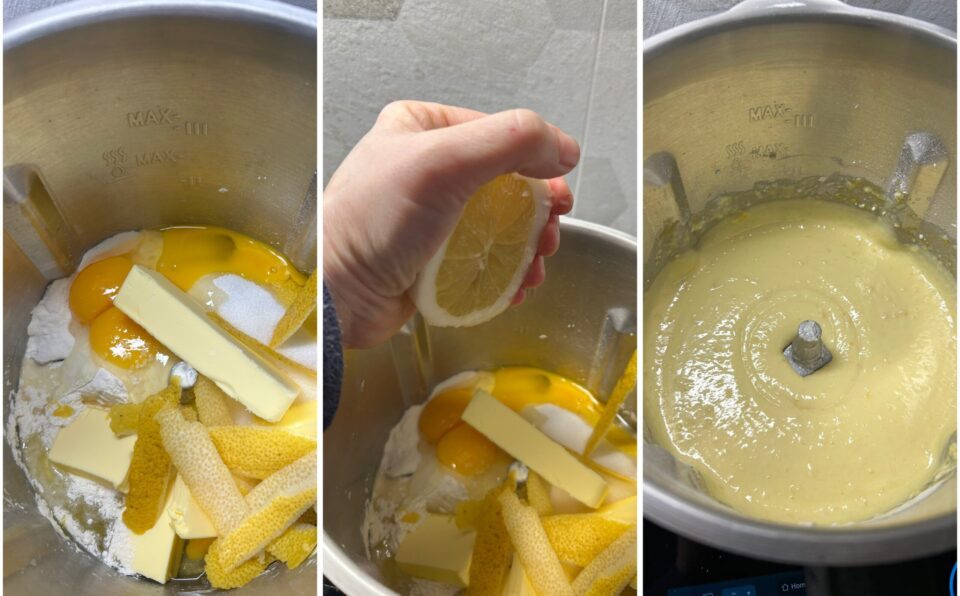 Per fare questo plumcake al limone e yogurt con il bimby o simili, raccogliete nel boccale del frullatore la farina, l’amido, lo zucchero, le uova a temperatura ambiente, il burro non troppo freddo, la scorza di un limone biologico pelata con un pela patate e il succo di mezzo limone. Frullate tutto fino ad ottenere un composto omogeneo, basteranno 2 minuti a velocità media e un minuto al massimo della velocità.