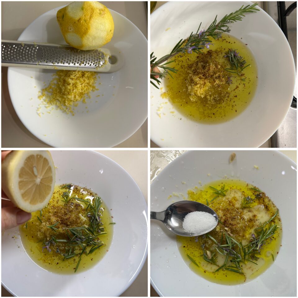 Lavate il limone, asciugatelo e grattugiate finemente la scorza. Raccoglietela in una ciotola e aggiungete l’olio extravergine d’oliva, il rosmarino, un pizzico di sale, pepe, il succo di limone e le eventuali altre spezie che preferite. Mescolate bene fino a ottenere un’emulsione profumata.