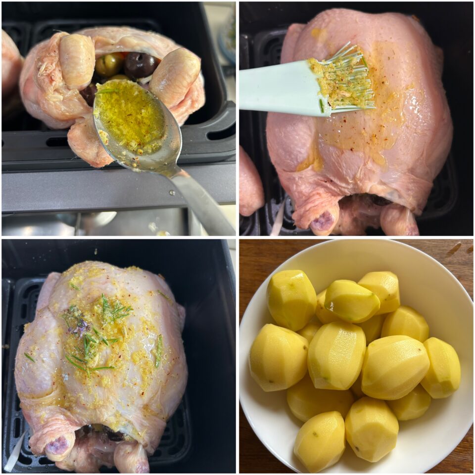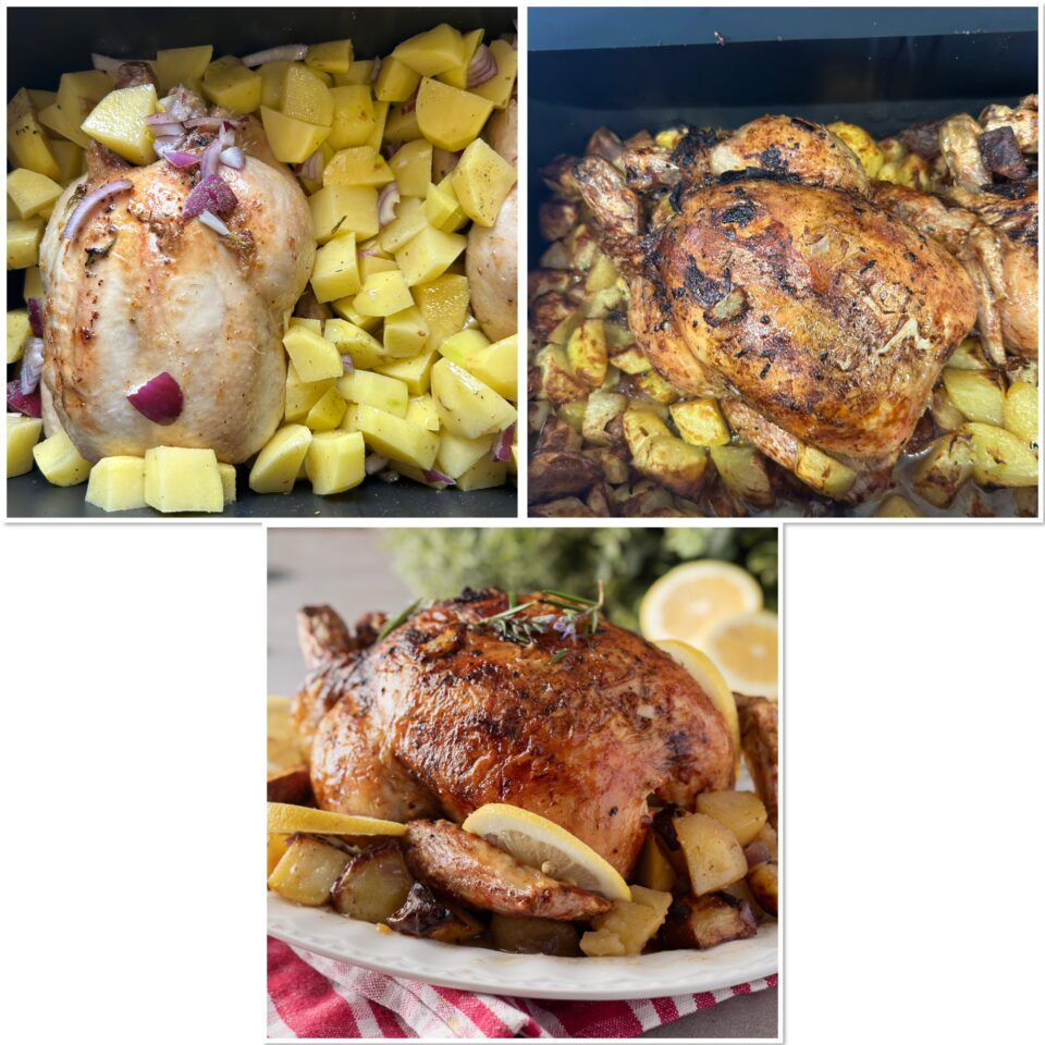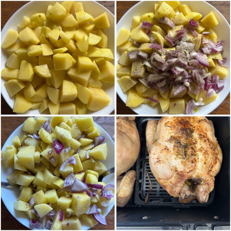 A fine cottura il pollo risulterà ben dorato, morbido e succoso, con le patate croccanti fuori e morbide all’interno. Sfornate e lascia riposare qualche minuto prima di servire. Io ho cotto utilizzando la mia friggitrice ad aria, che in realtà è un piccolo forno a tutti gli effetti per forma e dimensione ed ho cucinato contemporaneamente due polli e raddoppiando le dosi. Per friggitrice ad aria più piccole, i tempi sono più o meno simili, ma fate attenzione a non bruciare il pollo.