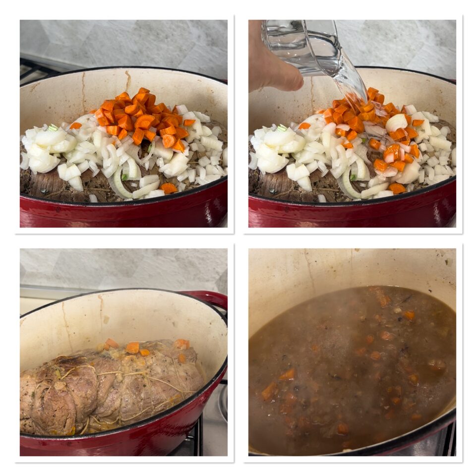 Abbassate la fiamma, unite un bicchiere d”acqua, le carote e le cipolle pelate e tagliate a cubetti e minimo per due ore e 15 minuti, non dovrebbe servire aggiungere altra acqua oltre questa e qualla rilasciata dalla carne.