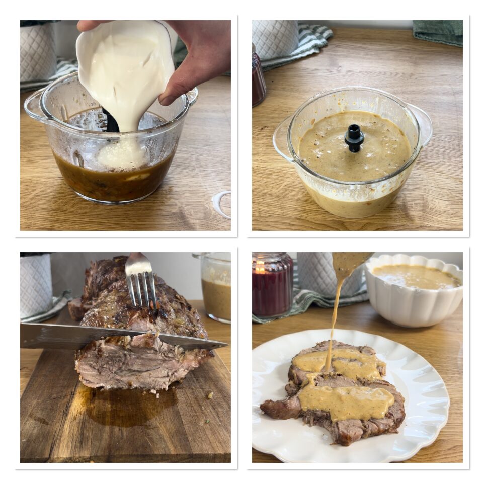 Raccogliete il fondo di cottura nel boccale del frullatore e unite la panna, frullate tutto per ottenere la salsa di accompagnamento.