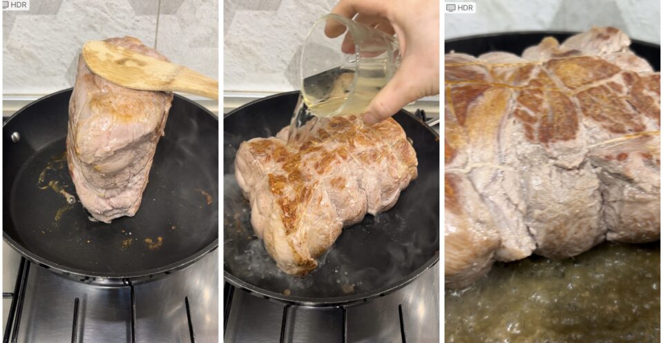 Adagiate il pezzo di carne nella pentola arroventata e e rosolate il pezzo di carne da tutti i lati rigirandolo in modo che si sigilli. Sfumate con il vino e evaporata tutta la parte alcolica (non dovrete più sentire l’alcol nell’aria), spostate la carne su una gratella, coprite con pellicola e tenete da parte.