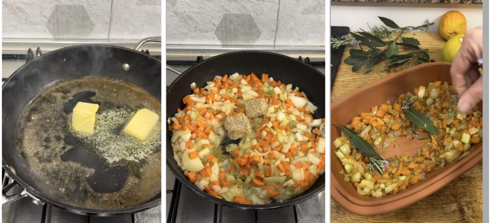 Nella padella dove avete rosolato la carne aggiungete il burro, lasciatelo sciogliere a fuoco dolce e unite il sedano, le carote e le cipolle, sciacquate, pelate e tagliate a cubetti. Aggiungete il sale, o il dado fatto in casa e lasciate insaporire. Ammorbidite e rosolate le verdure disponetele nella pentola di coccio (andrà bene anche una comune pentola di ghisa con coperchio o la classica rostiera), insieme a metà dell’alloro e del rosmarino.