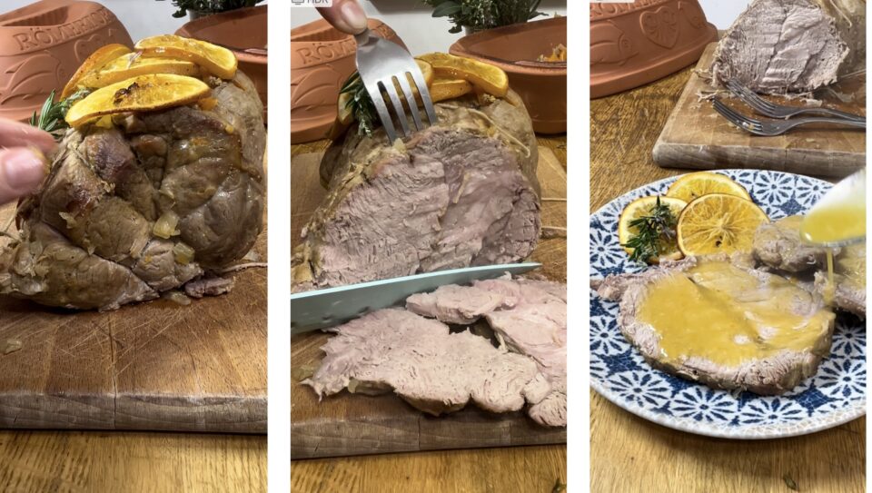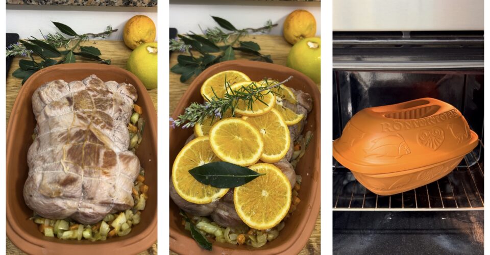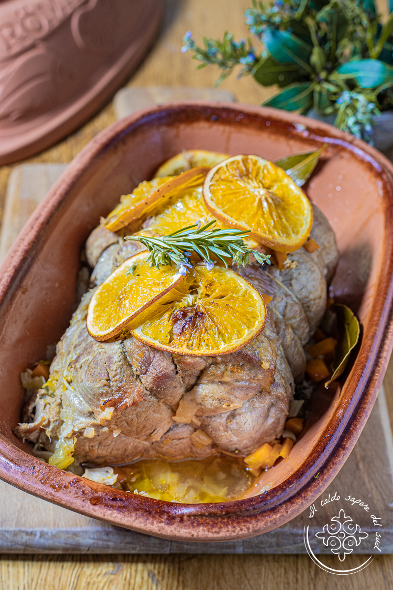 Arrosto di maiale morbidissimo, cotto al forno, nella pentola di coccio, una ricetta facilissima come l’arrosto alla salsa barbecue o l’arrosto di coppa al preosecco. Qualche giorno fa ho trovato in offerta al supermercato la famosa rostiera di coccio Römertopf, un tegame di terracotta pressata a forma di barca, con coperchio a cupola. Questa pentola speciale, ideale anche per le cotture a bassa temperatura, è ottima nella preparazione degli arrosti e catturando al suo interno tutti i succhi e i profumi, regala al piatto finito una morbidezza e un sapore delizioso. Naturalmente, se non avete questa pentola, potrete sostituire il tutto con una pentola di ghisa, una pentola in coccio classica o una pirofila con coperchio adatta. Avendo acquistato la pentola, e non vedendo l’ora di utilizzarla, ho chiesto al mio macellaio di fiducia un bel pezzo di capocollo di maiale (Coppa), un taglio che si cuoce senza difficoltà e che resta sempre molto morbido e succulento grazie alle venature di grasso che lo attraversano. Poi sono corsa in cucina per metterli all’opera, preparando questo arrosto al profumo d’arancia buonissimo e super tenero! Volete provarlo anche voi? Corriamo in cucina, con questo piatto stupirete davvero tutti i vostri ospiti, preparando un secondo piatto perfetto per Natale, Capodanno e tutte le domeniche di festa! Vi ricordo anche che se volete restare aggiornati sulle nuove ricette potete seguire mia pagina Facebook e il mio profilo Instagram.