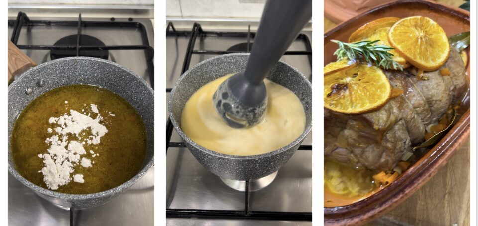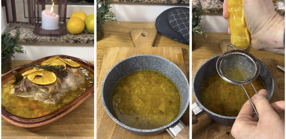 Trascorso il tempo, la carne dovrebbe essere cotta, ma in pirofila saranno rimasti tutti i succhi della stessa: non preoccupatevi, vi serviranno per realizzare il fondo di accompagnamento! Raccogliete quindi tutti i succhi e buona parte delle verdure in una pentola, unite il succo di un’arancia, il miele e la farina, mantenendo sempre in caldo la carne.