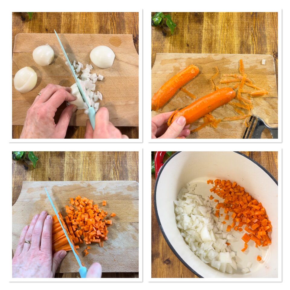 Pelate, sciacquate e tritate le cipolle, raccogliete tutto in una pentola capiente e dal fondo spesso, date un buon giro e rosolate a fuoco basso.