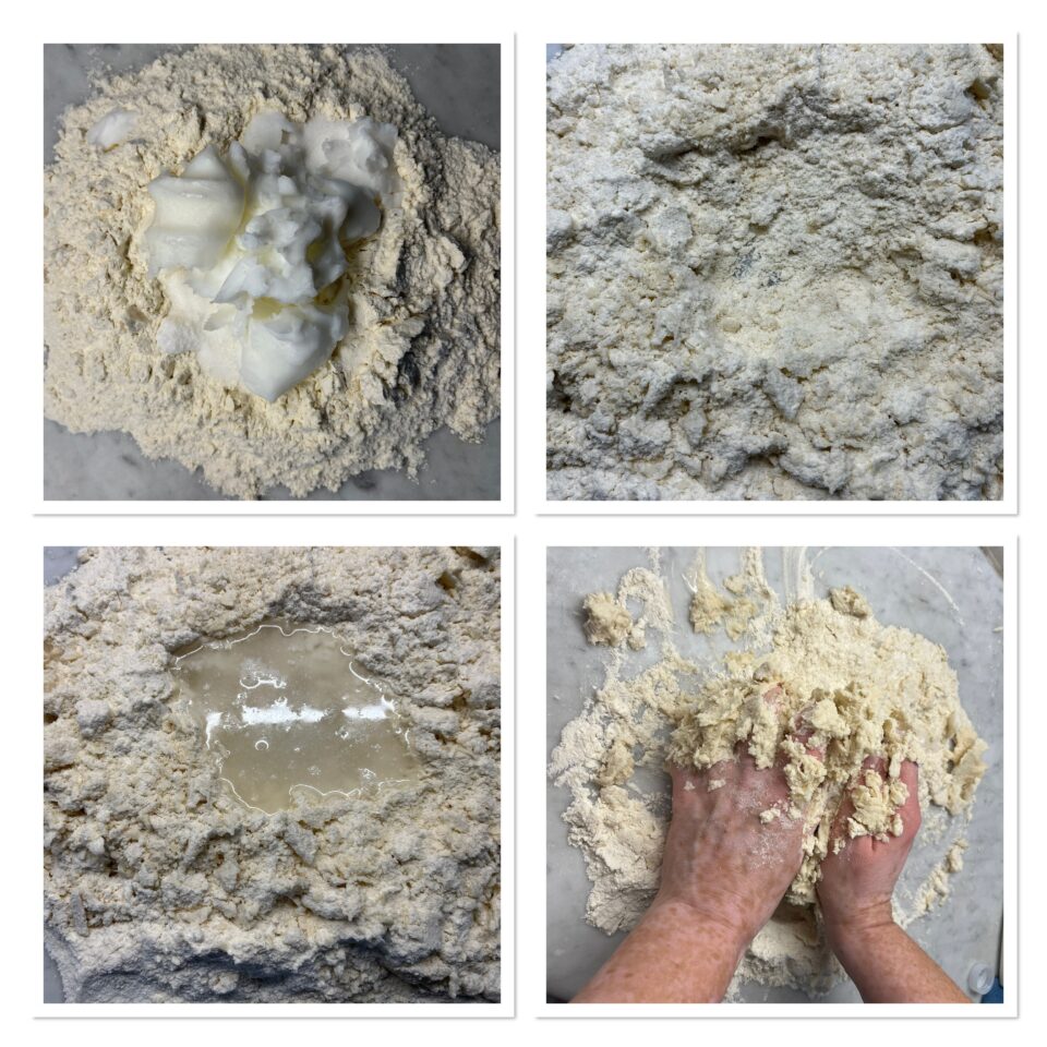 Versate la farina in una spianatoia, fate una fontana e aggiungete lo strutto. Lavoratelo insieme alla farina fino ad ottenere uno sfarinato, poi aggiungete l’acqua poco per volta e quella che prende (piò o meno la dose indicata), fino ad ottenere una messa liscia e omogenea.