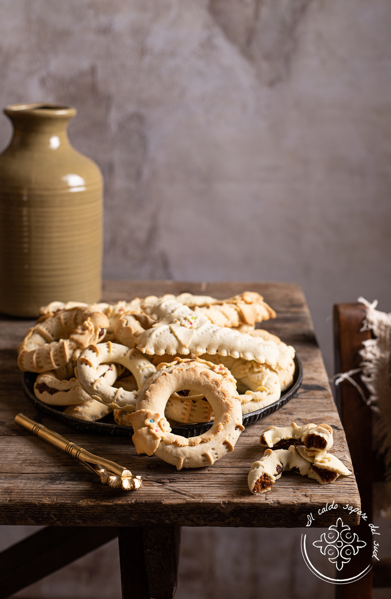 Cuddureddi di Caltagirone con il vino cotto, o collorelle di Caltagirone per alcuni. “Cuddureddi” in dialetto siciliano significa coroncina e a dirla tutta in Sicilia, di dolci che si chiamano “cuddureddi” ce ne sono un’infinita e ogni provincia ne conta almeno una almeno. I “cuddureddi” di Caltagirone, che alcuni italianizzando il nome chiamano collorelle, sono dei dolci tipici del calatino legati alle festività natalizie, realizzati con una base di frolla all’acqua senza uova e farciti con vino cotto, oppure mandorle o ancora miele. Qualche giorno fa vi ho spiegato come realizzare i “Cuddureddi di Caltagirone alle mandorle), oggi invece le prepareremo con il vino cotto, uno sciroppo che si confeziona durante il periodo della vendemmia e che si ottiene facendo restringere il mosto fino ad ottenere un liquido dolce, denso e profumato. Nell’ Italia meridionale i dolci realizzati con il mosto cotto sono davvero tantissimi, in Sicilia forse ancora di più e i “Cuddureddi di Caltagirone col vino cotto”, ne sono un pregevole esempio. Decoratissime, ricce e sontuose, le collorelle di Catagirone non sono solo buone, ma anche bellissime, decorate finemente con le pinze e gli strumenti da pasticceria, sono un dono speciale da scambiarsi durante le feste e un dolce delizioso. Oggi le prepareremo insieme, quindi armatevi di pazienza e seguitemi in cucina, ma prima di metterci ai fornelli, vi ricordo che se volete restare aggiornati su tutte le nuove ricette del blog, potete seguire mia pagina Facebook (qui) e il mio profilo Instagram (qui).