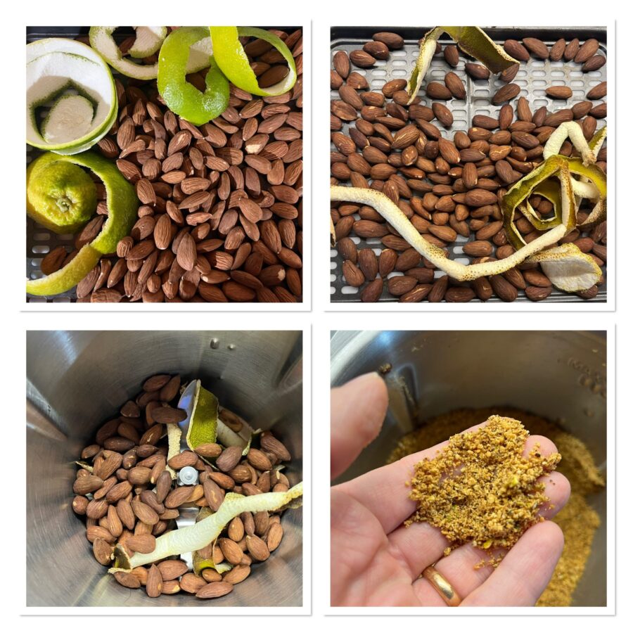 Raccogliete le mandorle in una teglia insieme alla scorza d’arancia e tostate tutto per 10 minuti a 180°, o fino a quando le mandorle non avranno preso colore e la scorza d’arancia non sarà diventata secca e rigida. La mia scorza d’arancia era verde, perché avendole preparate a fine ottobre le arance del mio albero erano ancora acerbe, ma comunque profumate. Lasciate raffreddare tutto e poi tritate sia le mandorle che la scorza d’arancia, fino ad ottenere una farina il più fine possibile. Fate attenzione a non scaldare troppo la frutta secca, perché espellerebbe l’olio, diventando un po’ ingestibile.