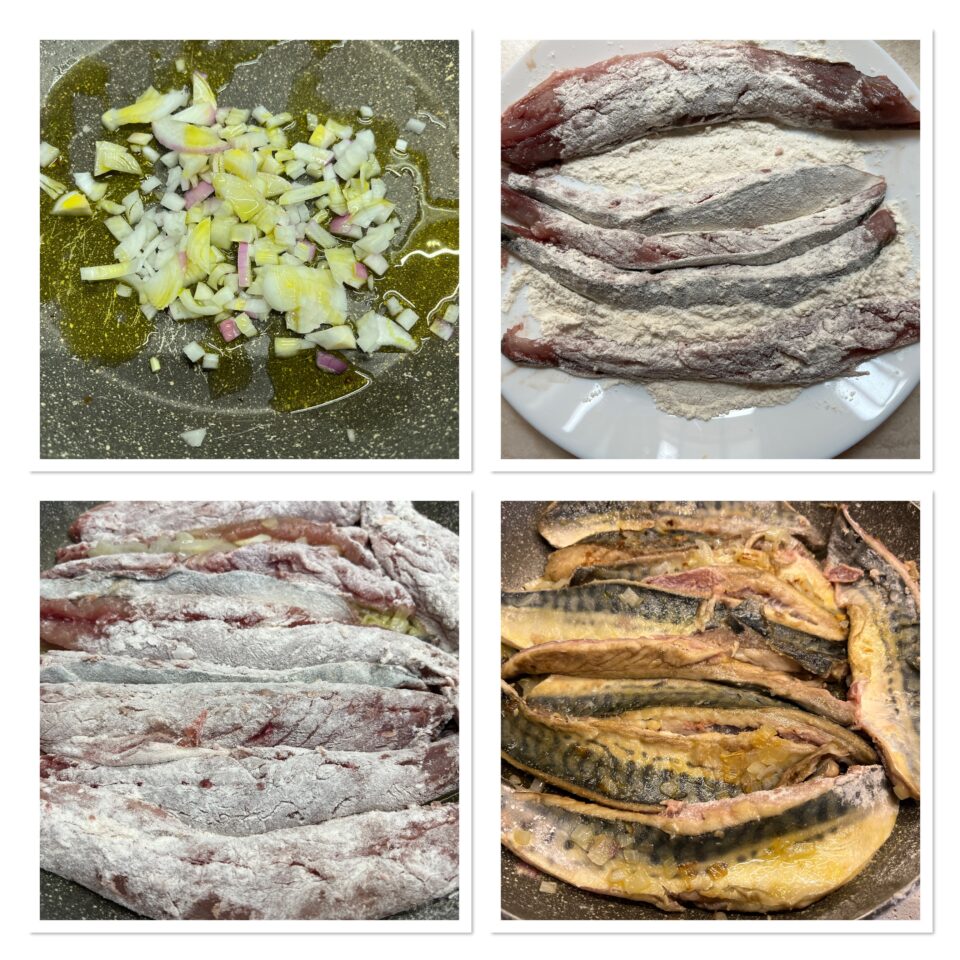 Pelate, sciacquate e affettate la cipolla, raccoglietela in una padella capiente dal fondo spesso e lasciatela appassire con un abbondante giro d’olio. Passate i filetti di sgombro nella farina, quindi adagiateli nella padella e rosolateli prima da un lato e poi dall’altro, rigirandoli delicatamente.