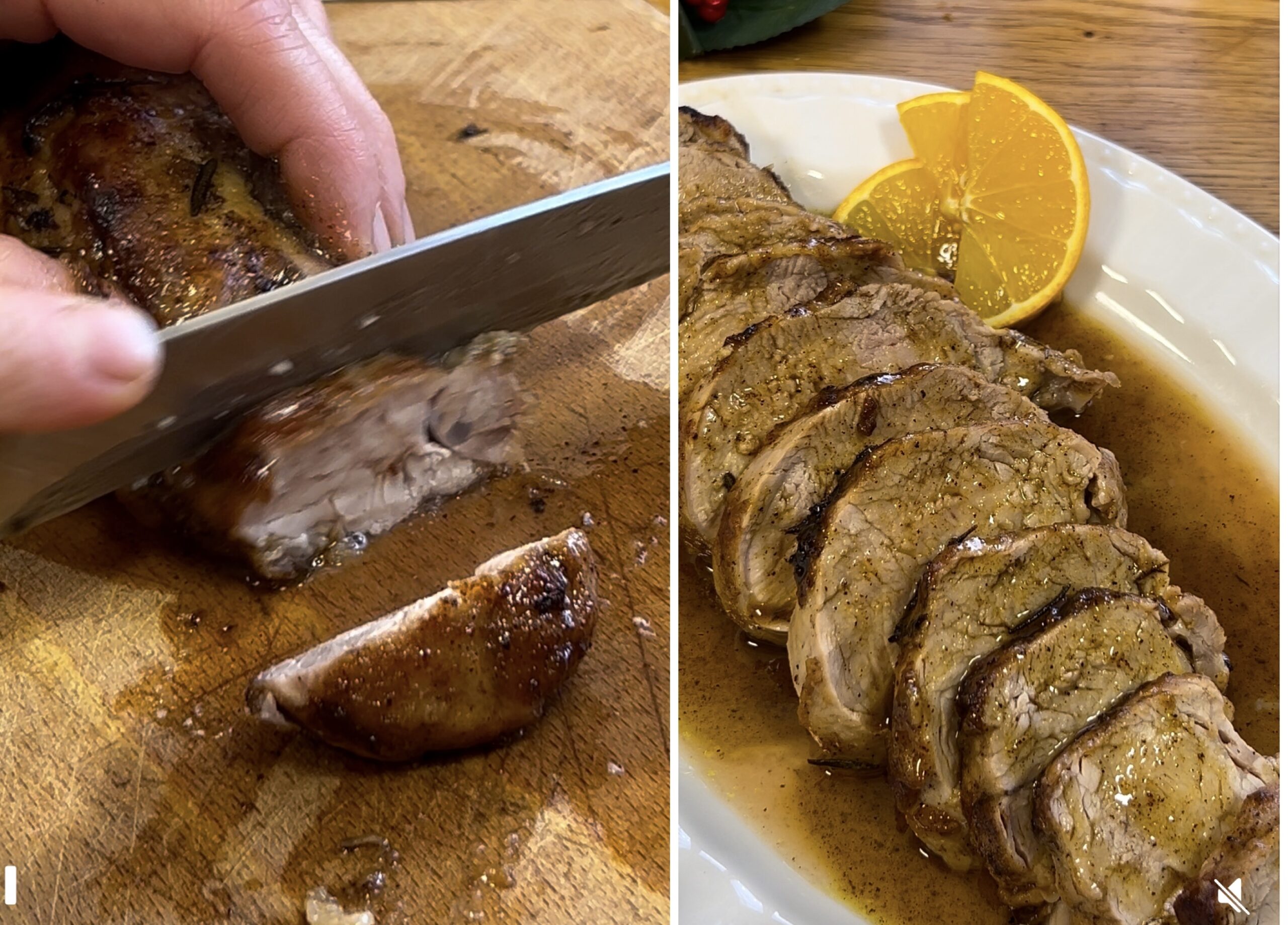 Una volta pronto, affettate e servite subito, con il fondo di cottura filtrato, emulsionato con una forchetta e utilizzato come salsa.