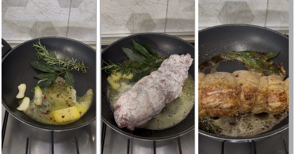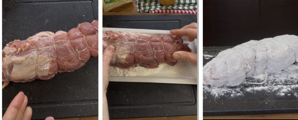 Dopo aver acquistato il filetto di maiale intero, legatelo con dello spago da cucina (non è un passaggio indispensabile ma vi aiuterà a mantenerne la forma) e passatelo nella farina, lasciate che vi aderisca molto bene da tutti lati e tenete da parte un attimo. Sciogliete delicatamente il burro in padella,