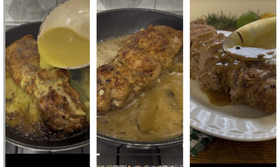 Versate questo mix sul filetto e cuocete per 35 minuti a fiamma moderata, irrorando con il fondo di cottura che pian piano si addenserà. Se avete un termometro da cucina, misurate la temperatura al cuore, che non dovrà superare i 70°C, né essere inferiore ai 65°. Io preferisco una cottura rosata (non cruda) a 65°C, la carne resta tenera e succulenta.