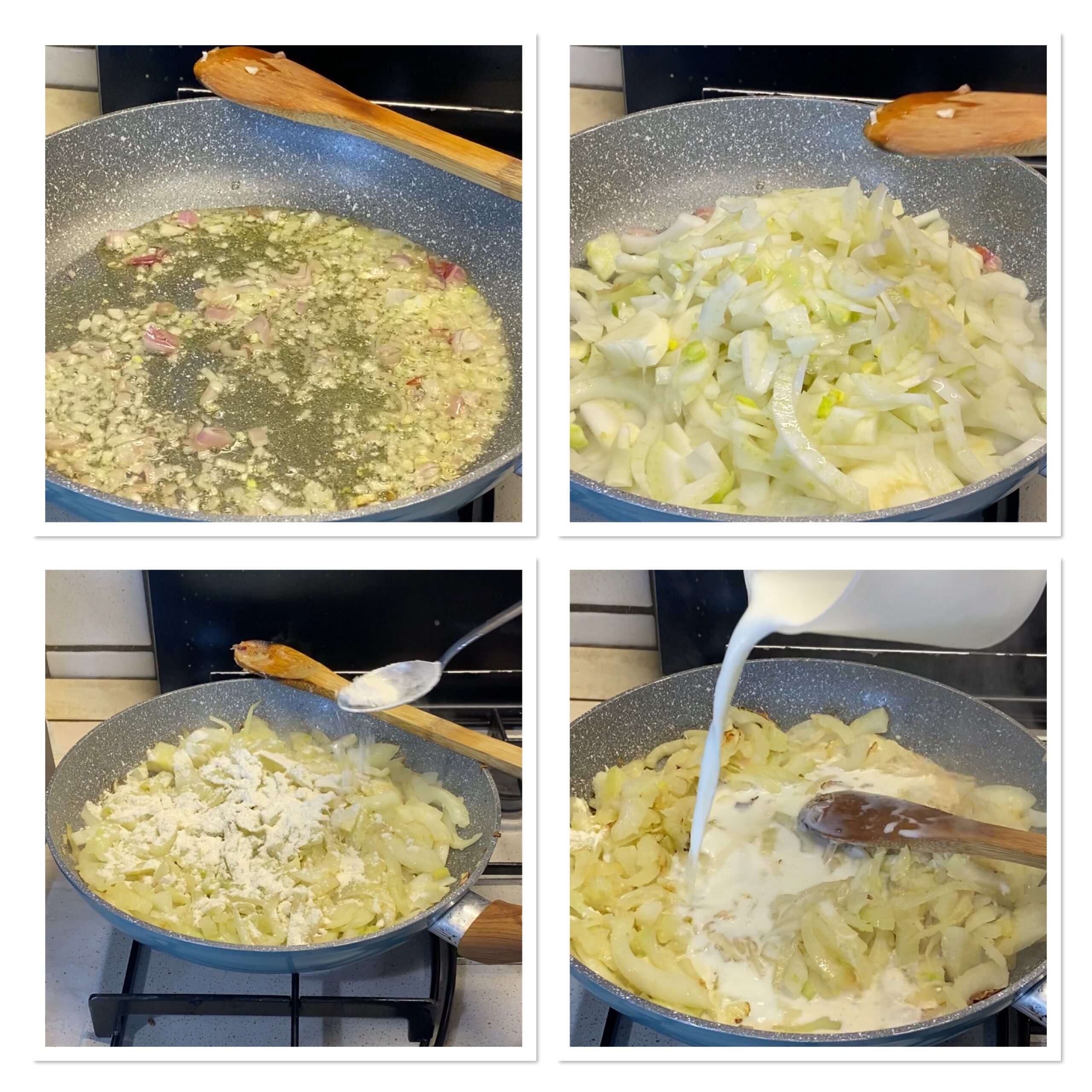 Unite i finocchi, aggiustate di sale e lasciate appassire a fiamma vivace, appena avranno preso sapore e ne sentirete il profumo aggiungete la farina e mescolate. Poco dopo versate il latte poco per volta e mescolando spesso.