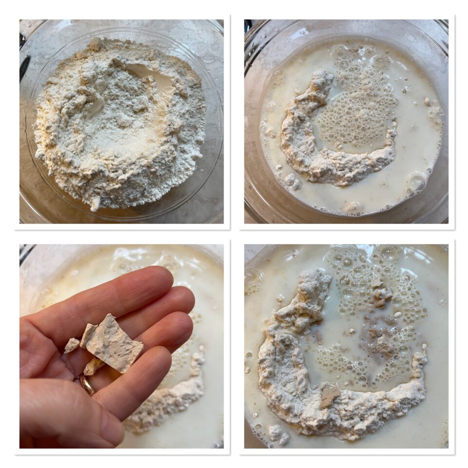 Per fare i fiocchi di neve cominciate dall’impasto: versate la farina in una ciotola, versate il latte e scioglietevi il lievito sbriciolato.