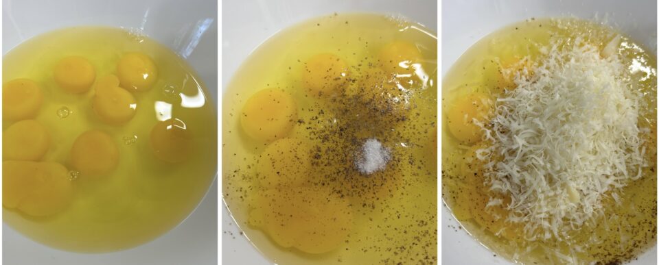 Raccogliete le uova in una ciotola, aggiungete sale, pepe e formaggio grattugiato, quindi amalgamate bene con la forchetta.