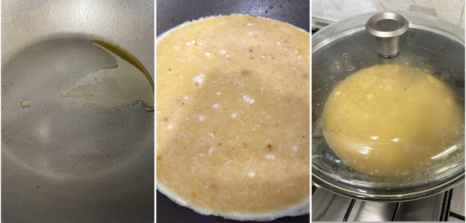 La base della frittata è pronta, per essere cotta, ma la mia mamma aggiunge anche un cucchiaio di pangrattato per renderla più corposa e un pizzico di lievito istantaneo per torte salate (lievito per dolci senza aromi) per renderla più soffice e spugnosa. Amalgamato il composto, scaldate una padella antiaderente con un filo d’olio e