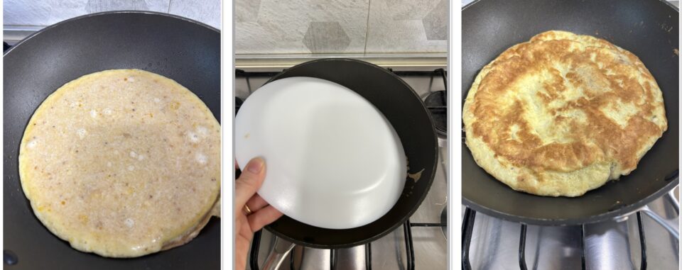 versatevelo dentro. Coprite con il coperchio e cuocete a fiamma bassa o molto moderata per circa 1o minuti, quindi con l’aiuto di un piatto rigirate la frittata e cuocete per altri 5 minuti.