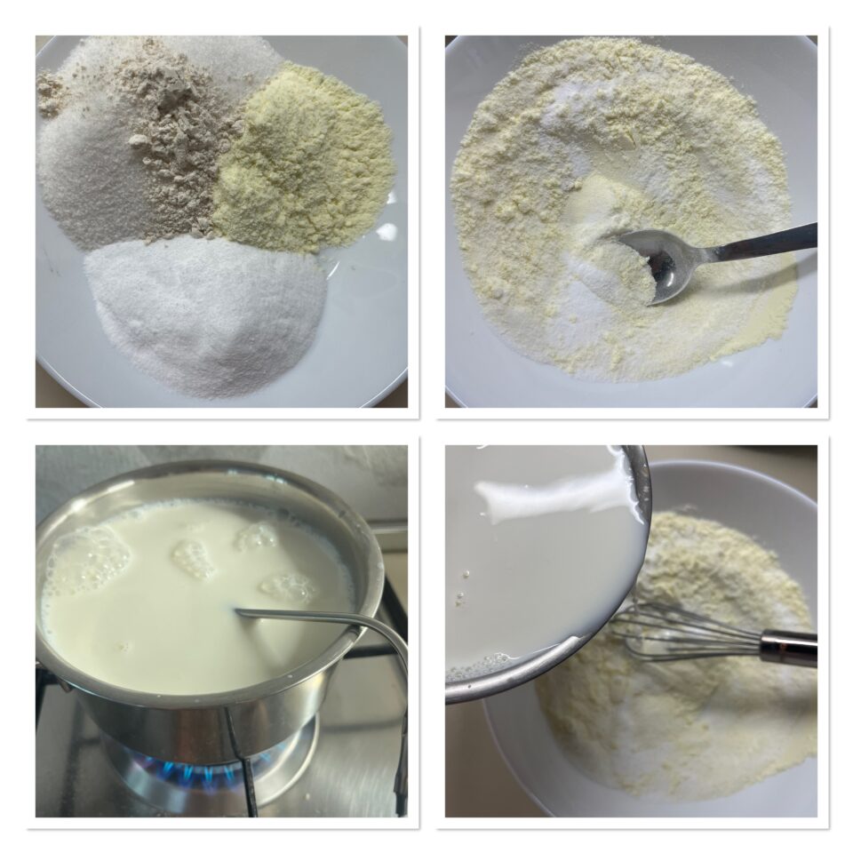 Raccogliete tutte le polveri in un contenitore e mischiatele tra loro. Versate latte e panna in una pentola, mescolate e portate quasi a sfiorare il bollore, dovrete raggiungere la temperatura di 85°C.