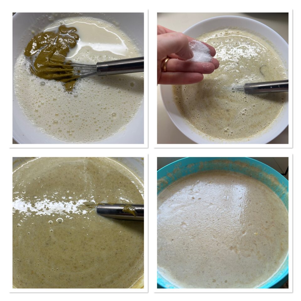 Versate questo liquido sulle polveri poco per volta, evitandi di formare grumi,