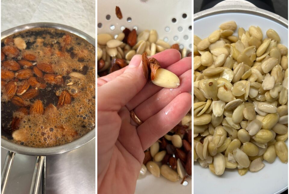 Immergete le mandorle in acqua bollente per circa 3-4 minuti, è importante che le mandorle siano pelate da voi, di solito quelle già pelate sono troppo secche e hanno perso l’aroma, inoltre reidratate avranno una resa migliore. Se avete qualche mandorla amara usatela pure o sostituite con delle gocce d’aroma. Scolatele, lasciatele intiepidire e peletele.
