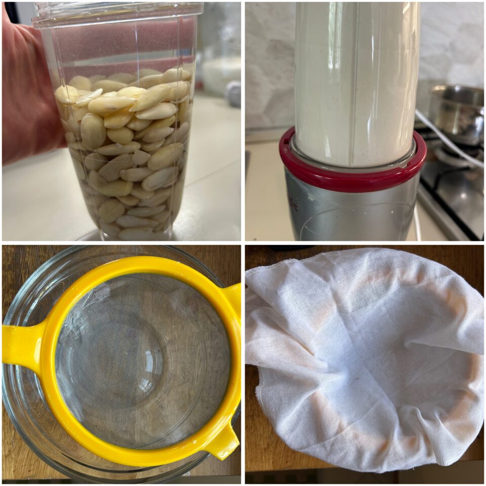 Frullate le mandorle con mezzo litro d’acqua: vi servirà un frullatore molto potente o un omogenizzatore, sopra vi ho messo link. Se non riuscite in una sola volta, procedete con una metà e poi con l’altra. Poggiate un colino su una ciotola, ricopritelo con un telo pulito che non odori di detersivo e versatevi il composto.