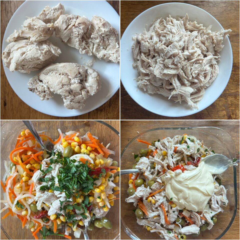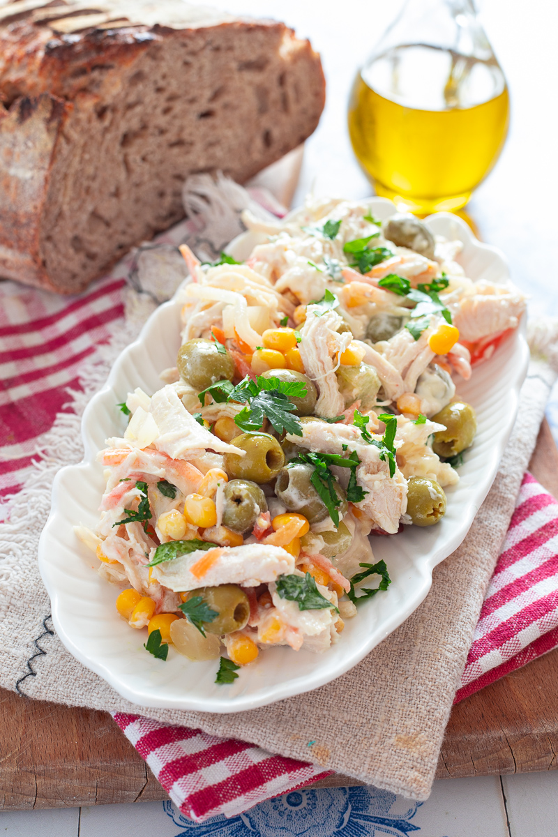 Come si fa l’insalata di pollo bollito con olive giardiniera e maionese