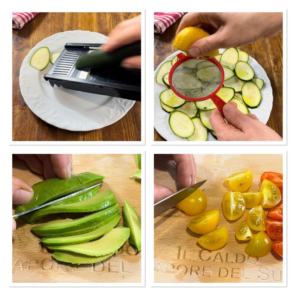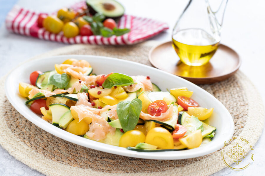 Insalata di zucchine crude e salmone affumicato, con pomodorini e avocado: un piatto fresco, leggero e pronto in pochi minuti.