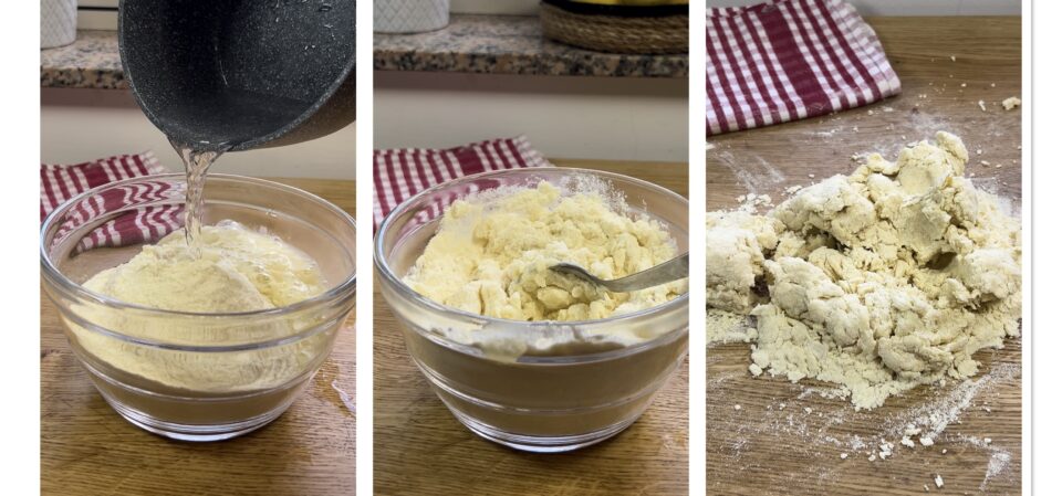 Versate la farina in una ciotola e aggiungete l’acqua molto calda poco per volta, mescolando con un cucchiaio. Ribaltate il tutto sulla spianatoia e lavorate l’impasto fino a quando non si presenterà compatto e omogeneo