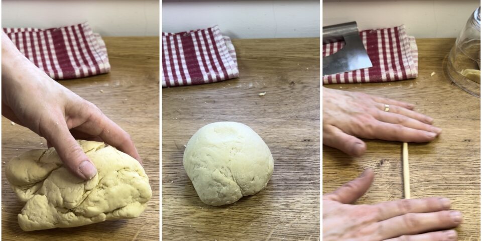 Formate una palla quanto più liscia e omogenea potete, copritela con una ciotola e lasciatela riposare una decina di minuti. Quindi tagliatene un pezzettino e tirate formando un cordoncino lungo e sottile, tenete al coperto il resto dell’impasto in modo che non si secchi.