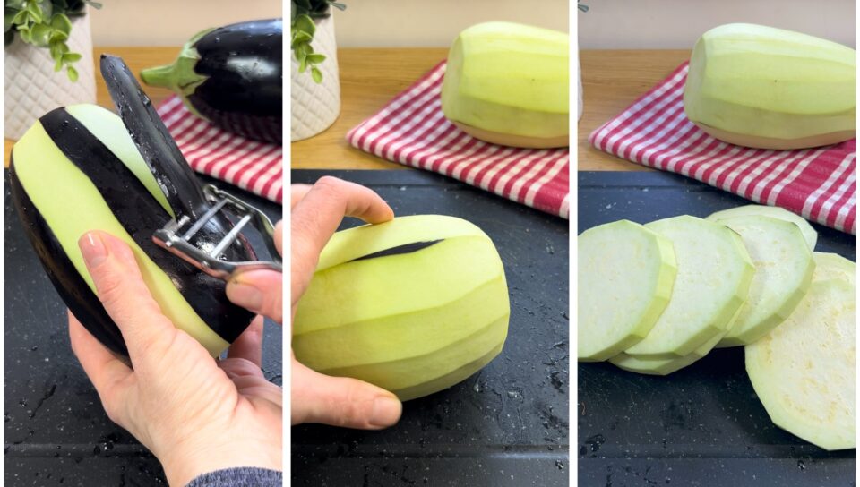 Sciacquate le melanzane, privatele del picciolo, pelatele e affettatela in modo da ottenere dei dischi spessi poco meno di 1cm.