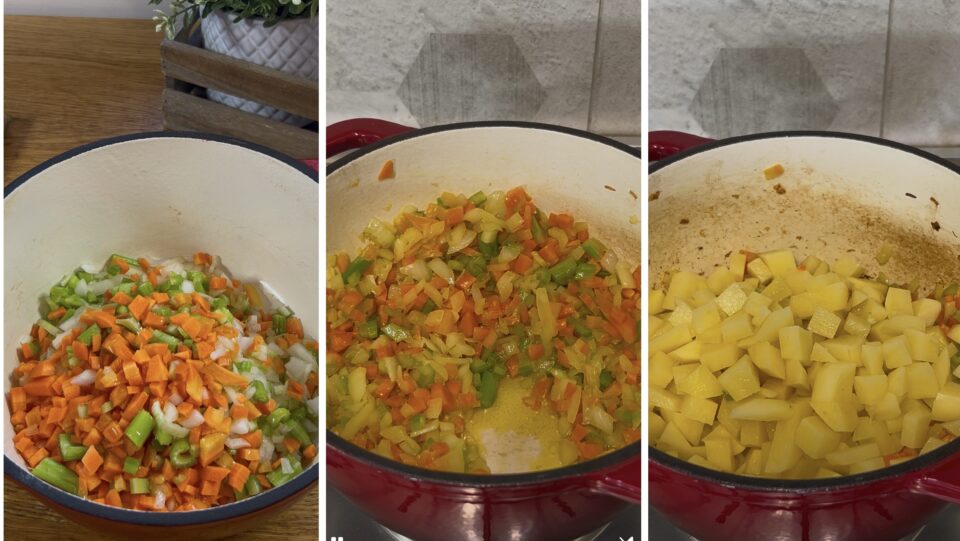 Pelate e sciacquate le carote, la cipolla e il sedano, quindi tritate tutto finemente. Raccogliete il battuto in una pentola e date un buon giro d’olio. Lasciate appassire a fuoco dolce e