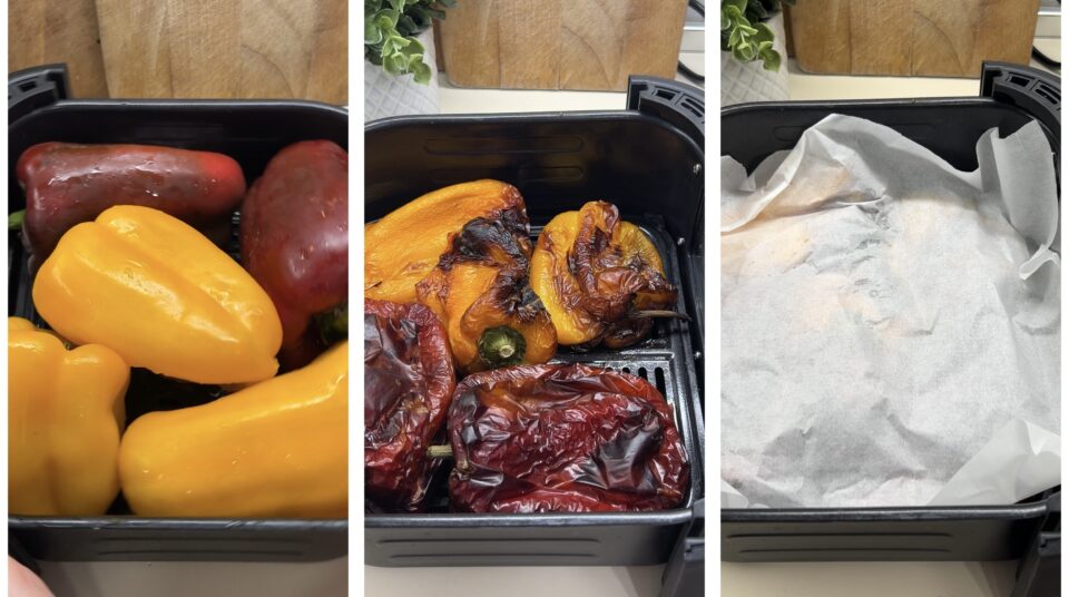 Cuocere i peperoni nella friggitrice ad aria è invece più semplice, intanto dovrete sciacquarli a riporli nel cestello. La mia friggitrice è da 6,5l e riesco a cuocerne 4-5, per friggitrici più piccole ne inserirete di meno. Disponete quindi i peperoni nel cestello e cuocete a 200°C per almeno 20 minuti, rigirandoli a metà cottura e cuocendo per altri 20. Una volta cotti copriteli con carta da forno e lasciateli riposare 15 minuti.