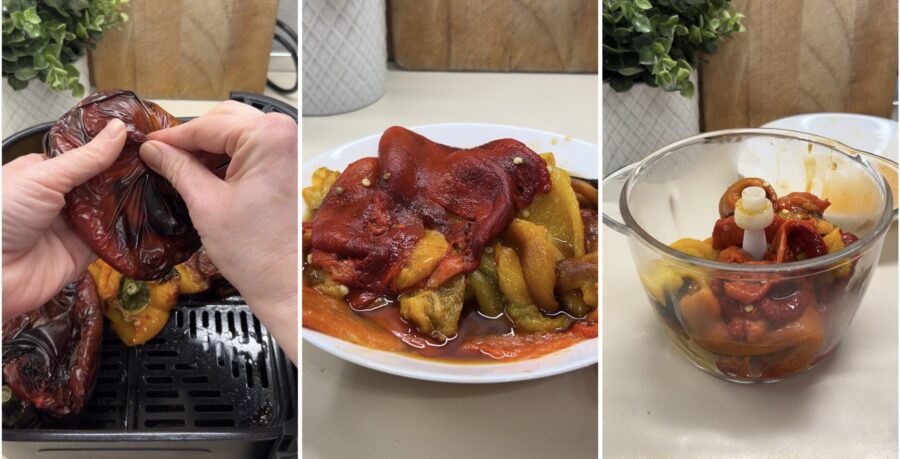Per fare questa ricetta serviranno dei peperoni arrostiti, potrete cuocerli in forno oppure in friggitrice ad aria. Per arrostirli in forno , accendete il grill, disponete gli ortaggi su una teglia bassa preferibilmente ricoperta di carta forno e posizionatela uno step più in basso dello “scalino” più alto.Non appena la pelle si abbrustolirà girateli e fate in modo che si cuociano uniformemente su tutti i lati, attenzione a non bucarli. Quando i peperoni saranno uniformemente cotti, dovrebbero bastare 35-40 minuti delicatamente in una ciotola e copriteli , lasciate riposare almeno 25-20 minuti.