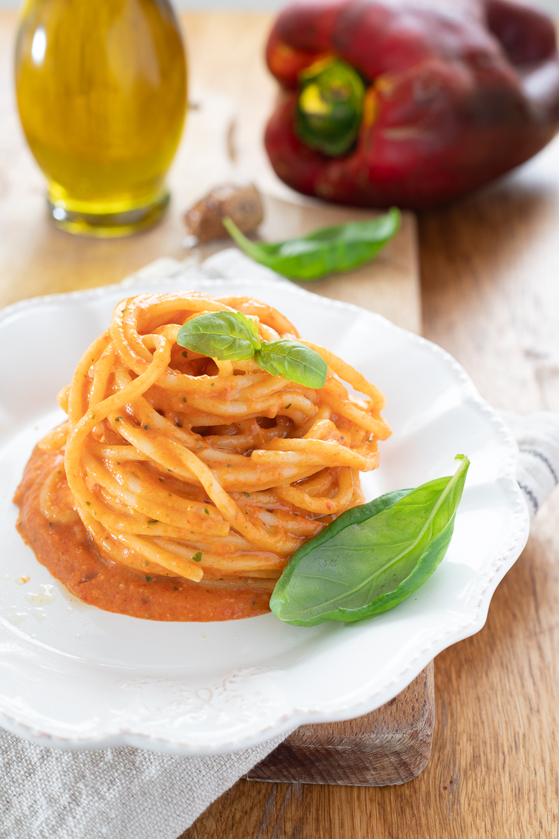 Pasta con i peperoni semplice, un primo piatto vegetariano gustoso, condito con una crema di peperoni arrostiti, parmigiano e basilico, semplice e deliziosa. Qualche giorno fa ho comprato i primi peperoni della stagione, forse un po’ in anticipo, ma io non resisto alle ricette facili e veloci con i peperoni e soprattutto amo i Primi piatti con i peperoni e così anche questa volta come ogni anno ho iniziato ad acquistarli un po’ prima dell’estate. Quando li ho portati a casa pensavo di preparare Insalata di peperoni arrostiti e tonno, ma una volta Arrostiti i peperoni nella friggitrice ad aria, ho cambiato idea, e li ho trasformati in una bella salsa colorata e saporita che ho utilizzato per condire un piatto di spaghettoni da leccarsi i baffi, profumato di basilico!! Corriamo in cucina, vi racconto la ricetta, ma prima di metterci ai fornelli vi ricordo che se volete restare aggiornati su tutti i miei nuovi piatti , potrete seguire la mia pagina Facebook (qui) e il mio profilo Instagram (qui).