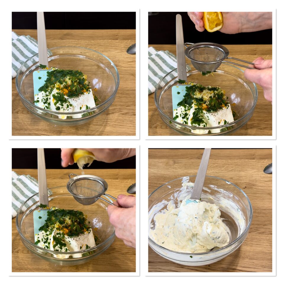 Raccogliete la robiola e il mascarpone in una ciotola, aggiungete sale, olio, prezzemolo, succo d’arancia, succo di limone e la scorza di entrambi grattugiata.
