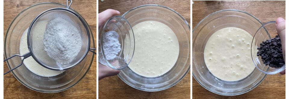 Unite la farina assicurandovi di setacciarla per evitare di formare grumi, poi il lievito ed infine le gocce di cioccolato.