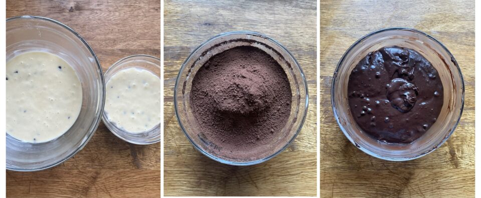 Separate il composto in due ciotole in parti uguali ed unite ad una di queste il cacao. il composto risulterà piuttosto denso, quindi aggiungete ciò che resta del latte (o quanto basta per mantenere la stessa consistenza della metà chiara).