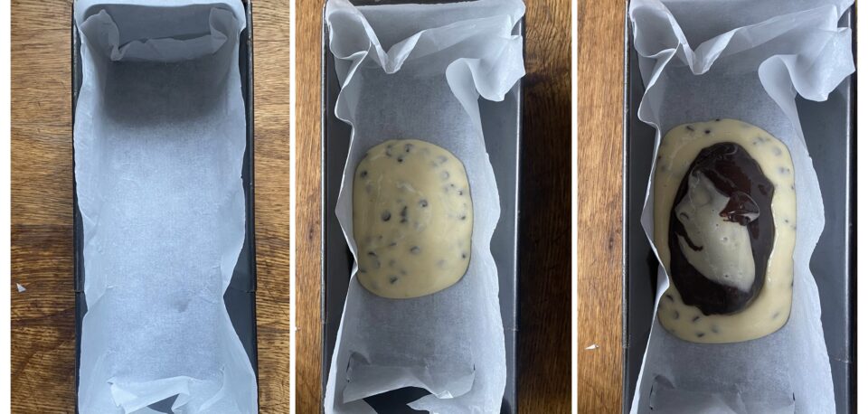 Preparate una pirofila con la carta forno, e ponete in alternanza un mestolo di composto bianco e nero per ottenere l’effetto marmorizzato del classico plumcake bicolore.