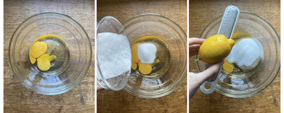 Per fare il plumcake bicolore al cioccolato e vaniglia con la ricetta della nonna, iniziate unendo in una ciotola le uova, lo zucchero e la scorza di limone.